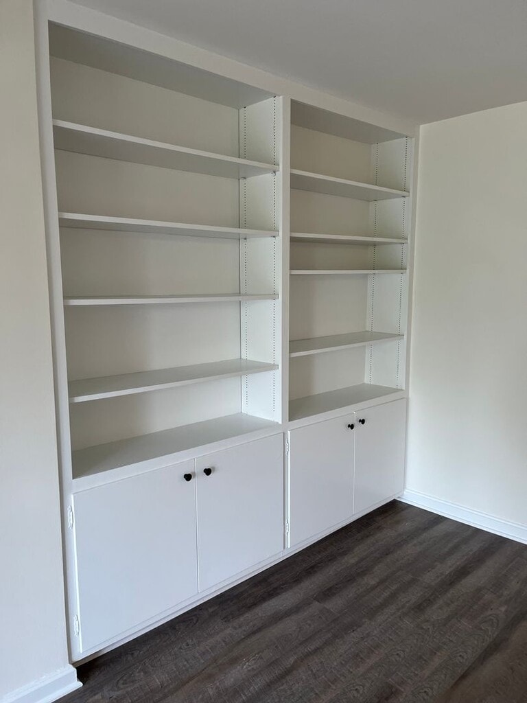 - Muchas estanterías con puertas de cristal en la sala de estar.