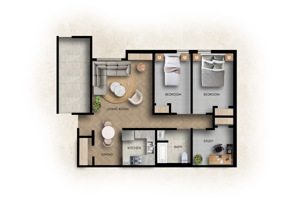 2 Dormitorios, 1 Baño, 775 pies²Galería del Modelo