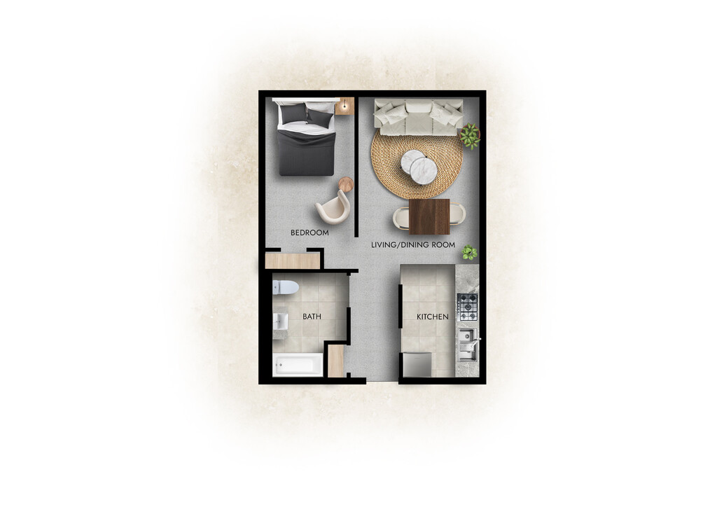1 Bed, 1 bath - Plano 1 2 Dormitorios