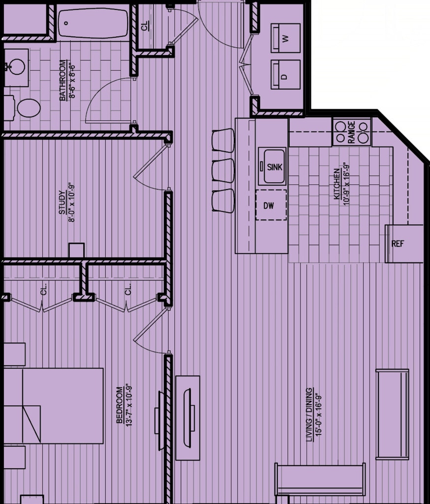 1 Dormitorio, 1 Baño, 950 pies²Disponible AhoraGalería del Modelo