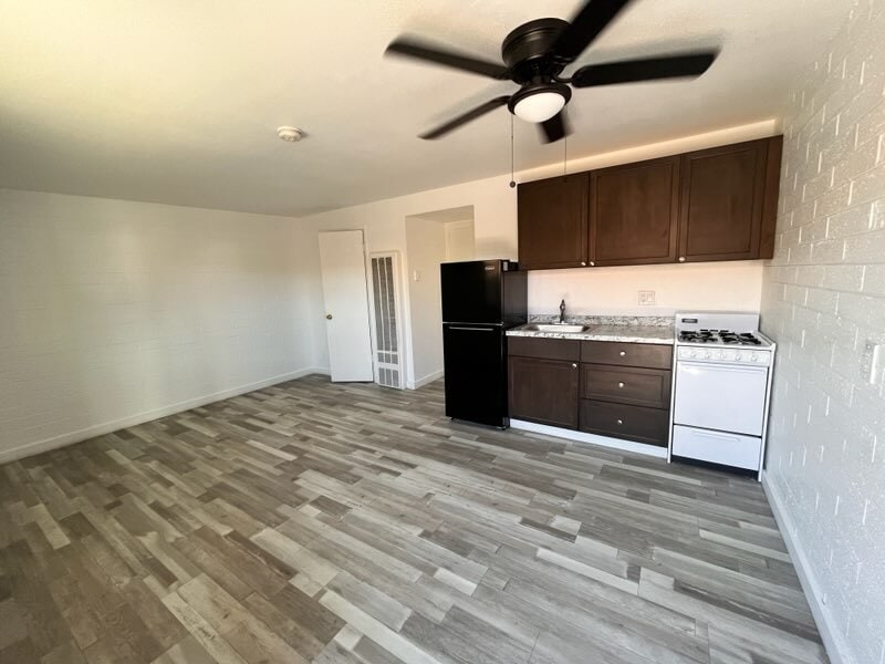 August 5, 2015these apartments are a little on the old side but completely remodeled...they look very good when you first walk in..they are studio apartments...basically one big room..half linoleum kitchen side with gas stove and half carpet..living room side...nice big a/c..a big walk in closet and bathroom..there are two identical one story buildings...side by side..eight apartments to a building...thing I like best about these studios is...mostly brick walls..interior brick walls...very uncommon...the ...walls separating apartments are brick which absorb sound better..however...rent has gone up twice in three years by..$80...$469 mo. .electric is not included...only bad thing worth mention...some wall deterioration in bath...needs repair..and door needs weather stripping..they are close to ...mill ave section by a.s.u...where all the shops are..Leer MásReseña de Apartments.com