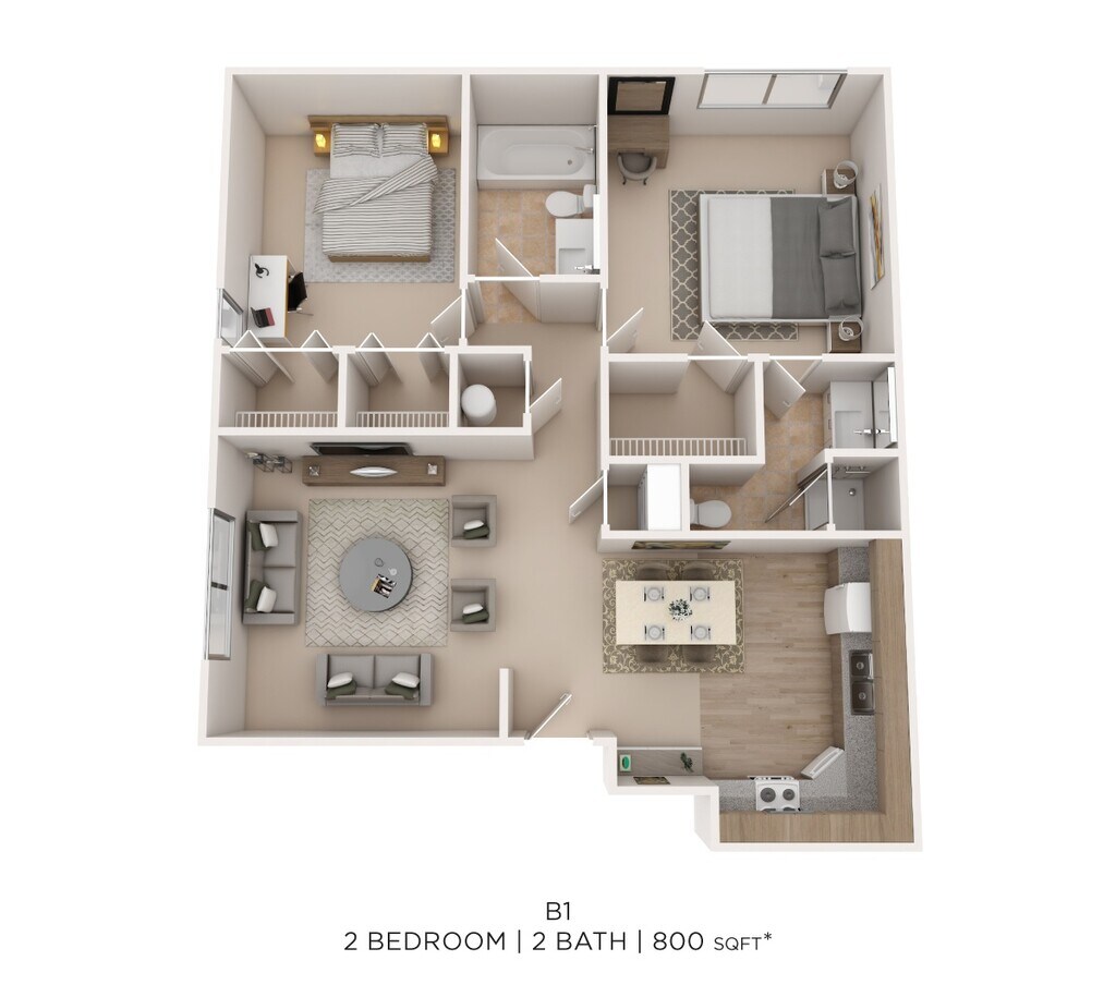2 Dormitorios, 2 Baños, 800 pies²Disponible AhoraGalería del Modelo