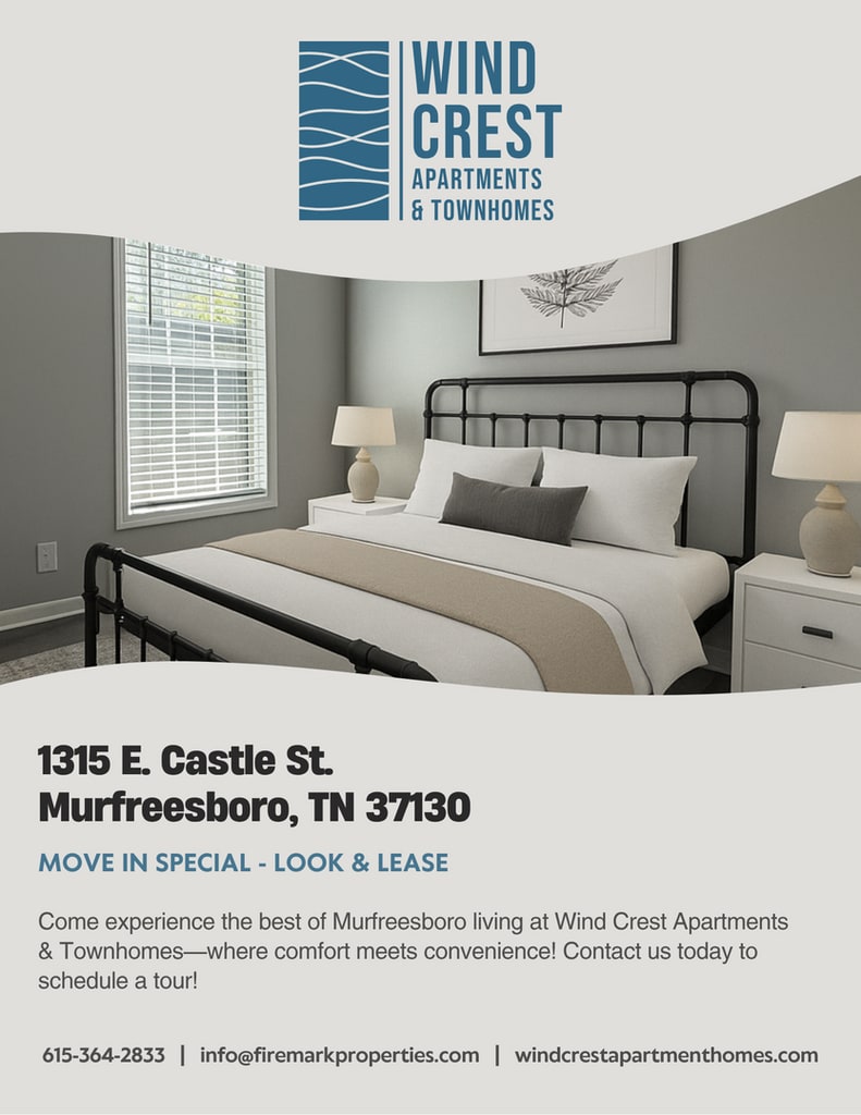 Welcome to Wind Crest Apartments & Townhomes, where comfort and convenience come together in the heart of Murfreesboro! Offering a variety of spacious floor plans, we have something for everyone, including 1-bedroom, 1-bath and 2-bedroom, 1-bath apartments, as well as 2-bedroom, 1.5-bath and 3-bedroom, 2-bath townhomes. Our community is designed to make life easier with on-site laundry facilities, professional on-site staff, and a sparkling swimming pool perfect for relaxing on warm Tennessee days. Conveniently located just minutes from Middle Tennessee State University (MTSU), Barfield Crescent Park, and a variety of shopping and dining options, Wind Crest puts you close to everything you need. Plus, with easy access to Nashville—just a 30-minute drive away—you’ll enjoy a quick commute to work, entertainment, and nightlife. Come experience the best of Murfreesboro living at Wind Crest Apartments & Townhomes—where comfort meets convenience! Contact us today to schedule a tour! SCAM ALERT: We DO NOT post on CRAIGSLIST! We will not ask you for any money until you APPLY through OUR WEBSITE (ONLY). The ONLY PAYMENTS we accept are through an ONLINE PORTAL with our company or via PaySlip.