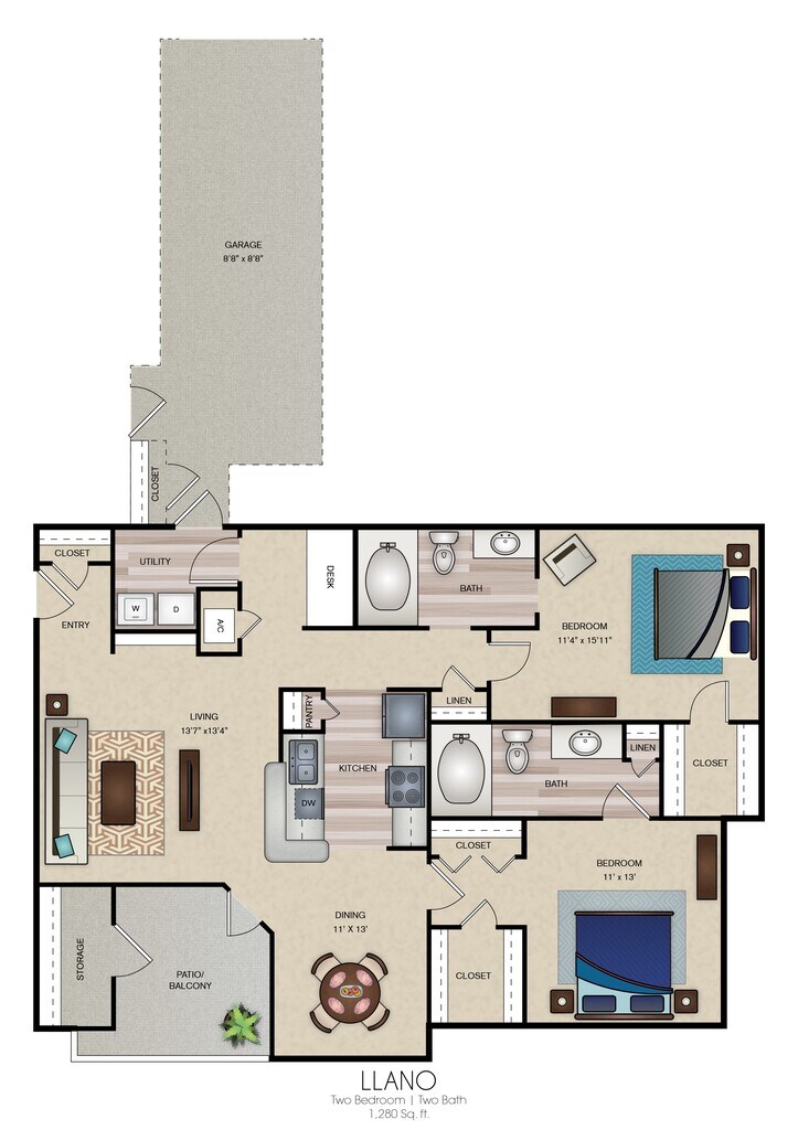 2 Dormitorios, 2 Baños, 1195 pies²Disponible AhoraEl más grandeEsta opción tiene las unidades más grandes para este modeloGalería del Modelo