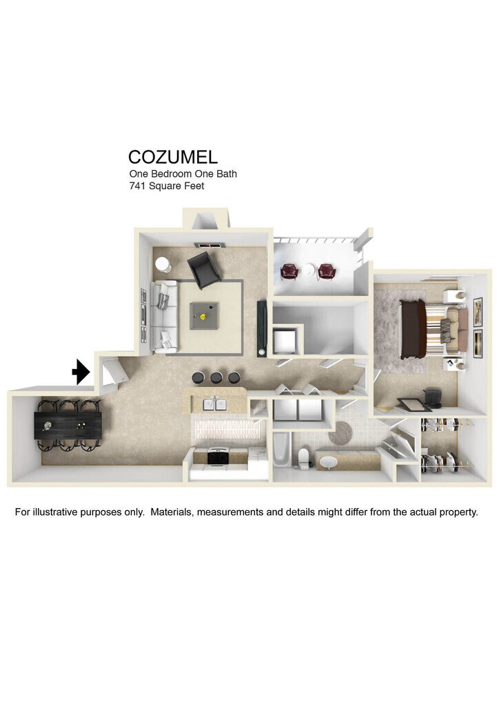 Modelo de apartamento: Cozumel$9251 Dormitorio, 1 Baño, 741 sq ftNo DisponibleCozumel - Plano 1 2 Dormitorios