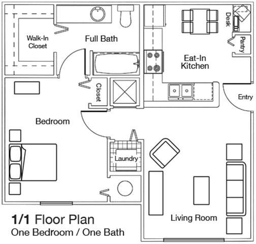 Modelo de apartamento: One Bed - One Bath Phase I1 Dormitorio, 1 Baño, 651 sq ftDisponible AhoraOne Bed - One Bath Phase I - Plano 1 One Bed - One Bath Phase II