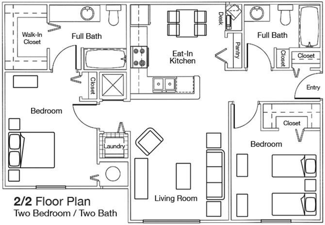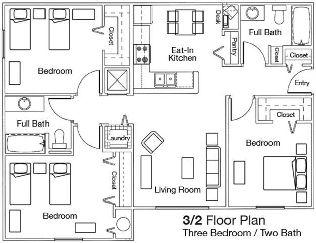 Modelo de apartamento: Two Bed - Two Bath Phase I2 Dormitorios, 2 Baños, 926 sq ftNo DisponibleTwo Bed - Two Bath Phase I - Plano 1 3 Dormitorios