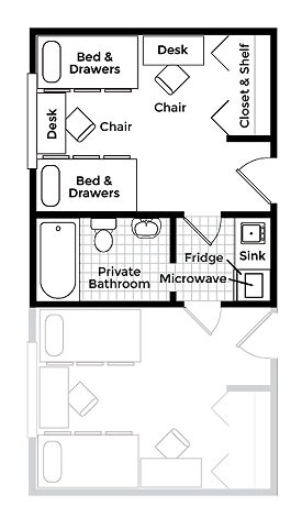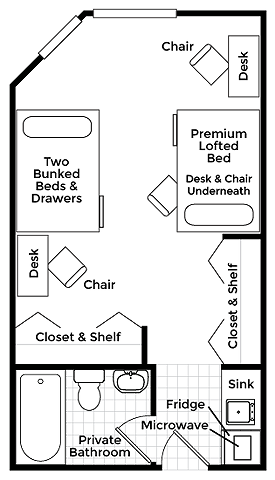 Modelo de apartamento: XL Single Private Bath1 Dormitorio, 1 Baño, 275 sq ftDisponible Ahora![]()