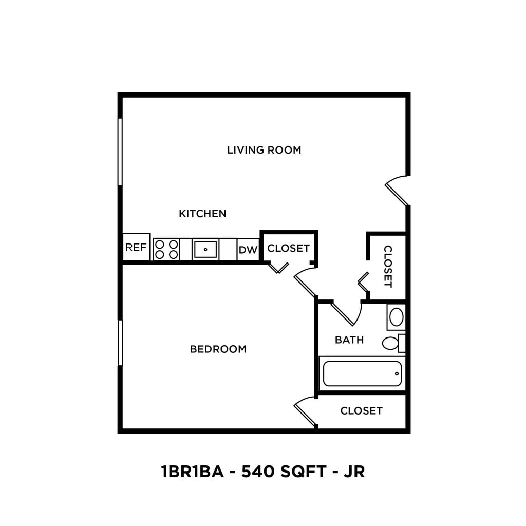 Modelo de apartamento: One Bedroom - 540 sqftLlame para PreciosEstudio, 1 Baño, 540 sq ftNo DisponibleOne Bedroom - 540 sqft - Plano 1 One Bedroom - 540 sqft - Plano 2 1 Dormitorio
