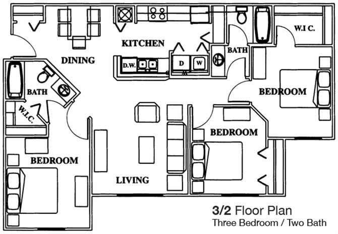 Modelo de apartamento: 2x22 Dormitorios, 2 Baños, 964 sq ftNo Disponible2x2 - Plano 1 3 Dormitorios