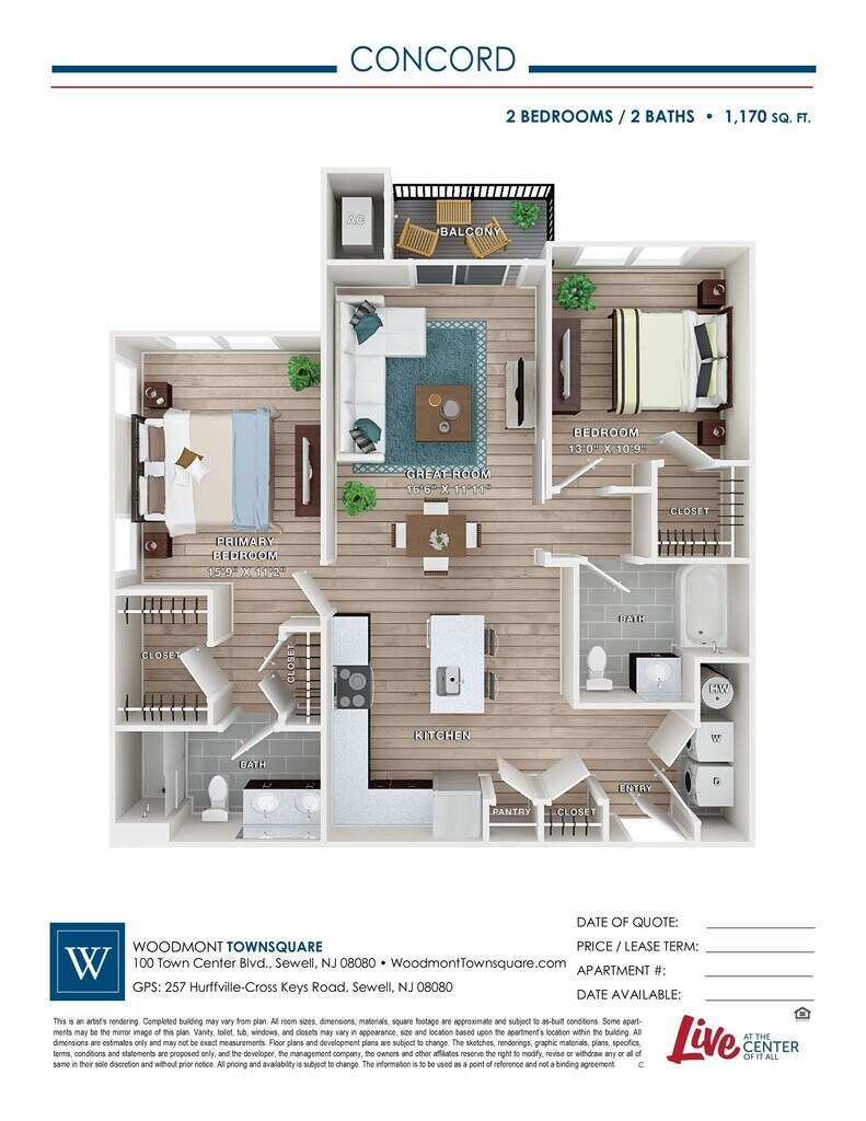 Victory - Plano 1 Unidad de apartamento: 4412Modelo de apartamento: Victory$3,1302 Dormitorios, 2 Baños, 1410 sq ftDisponible AhoraConcord