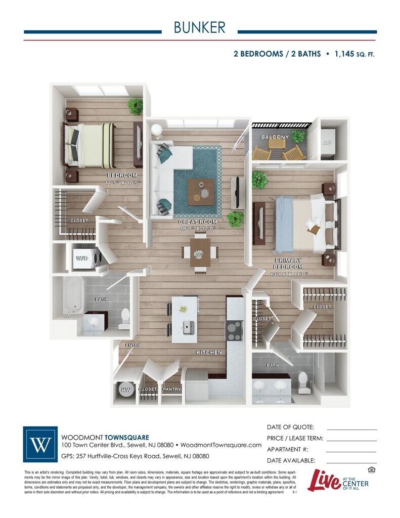 Bunker - Plano 1 Unidad de apartamento: 8308Modelo de apartamento: Bunker$2,4052 Dormitorios, 2 Baños, 1145 sq ftDisponible AhoraVictory