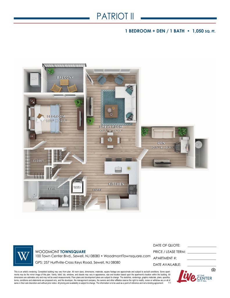 Modelo de apartamento: Patriot IILlame para Precios1 Dormitorio, 1 Baño, 1050 sq ftNo Disponible![]()