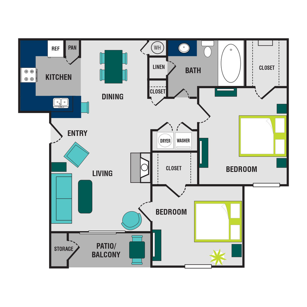 2 Dormitorios, 1 Baño, 876 pies²Disponible January 9, 2026Galería del Modelo