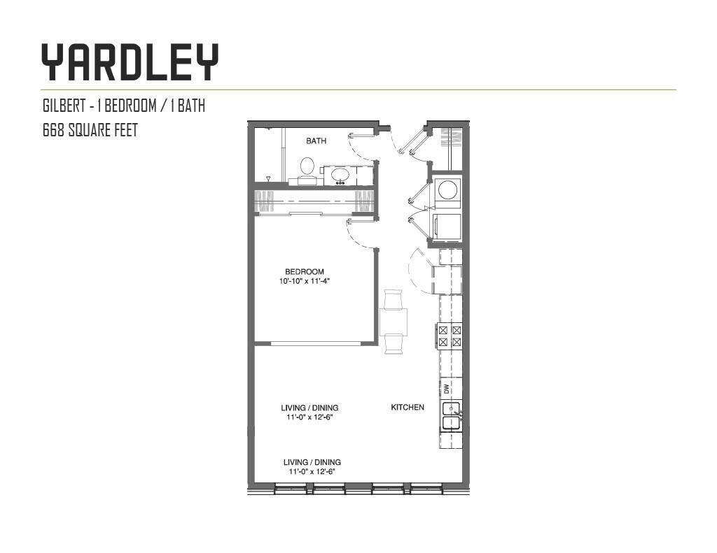 Gilbert - Plano 1 Unidad de apartamento: 236PAModelo de apartamento: Gilbert$1,1991 Dormitorio, 1 Baño, 668 sq ftDisponible AhoraElliot