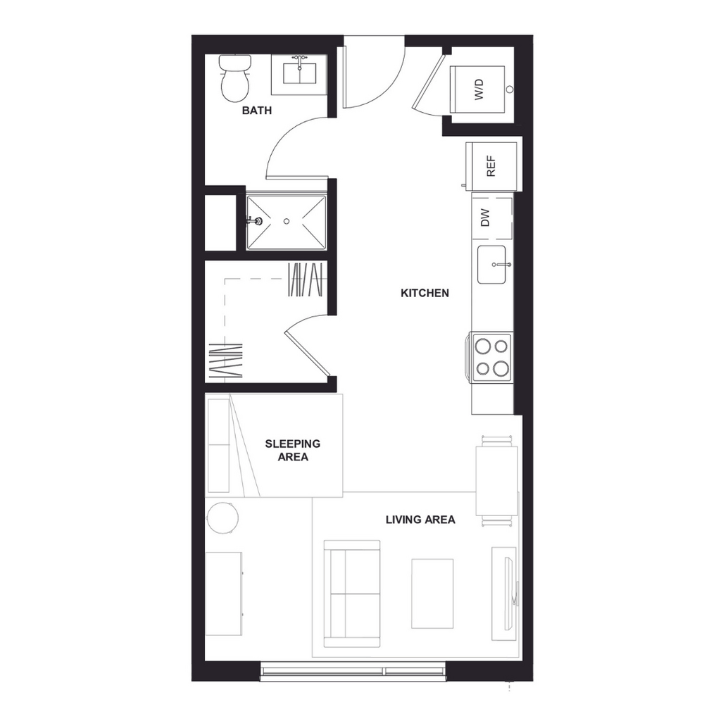 Modelo de apartamento: A5Desde $1,554Estudio, 1 Baño, 577 sq ftDisponible AhoraLos planos son representaciones artísticas. Todas las dimensiones son aproximadas. El producto y las especificaciones reales pueden variar en tamaño o detalle. No todas las características están disponibles en cada vivienda en alquiler. Por favor, consulta con un representante para obtener más detalles.
