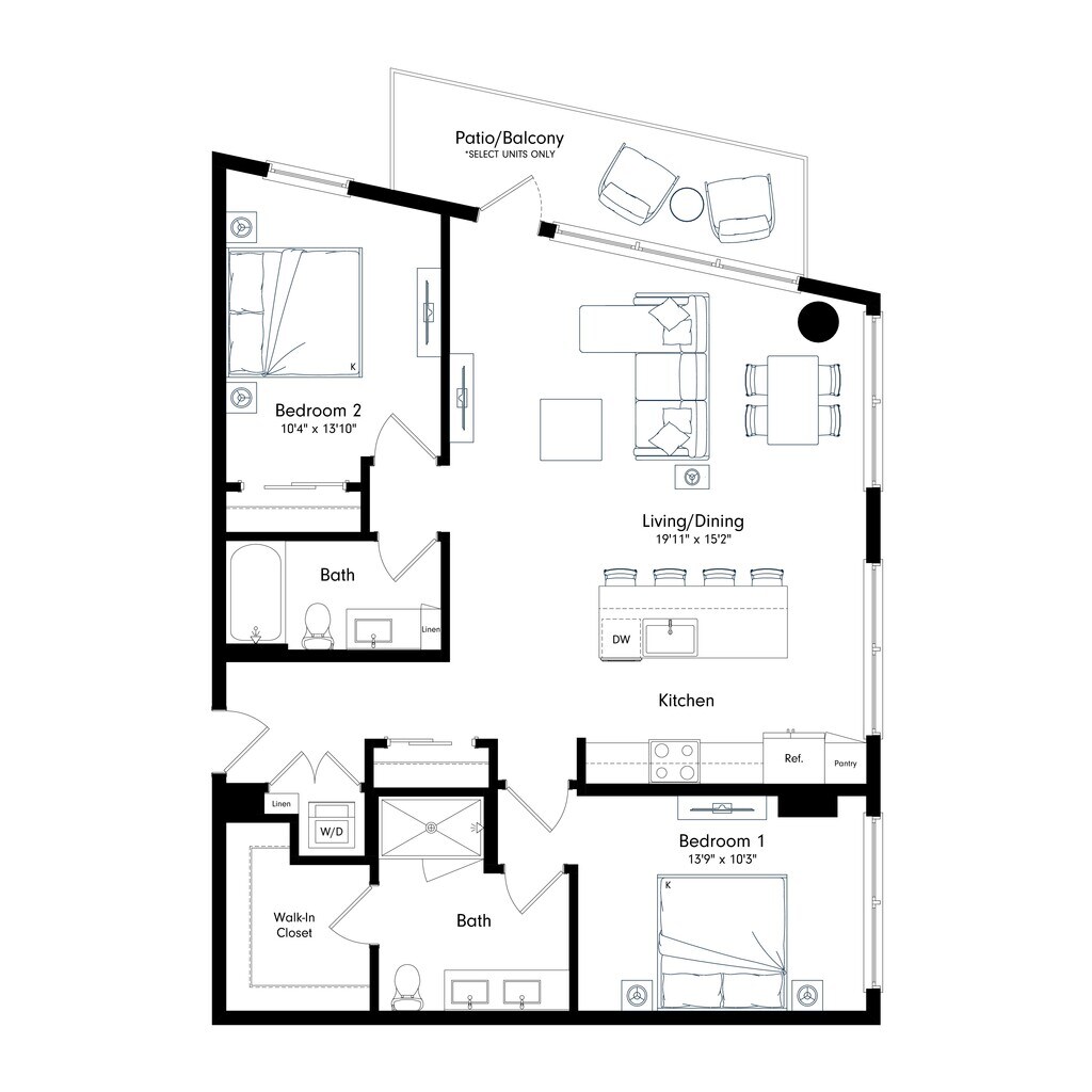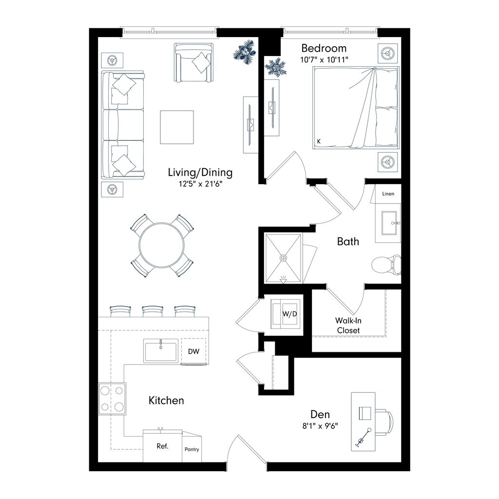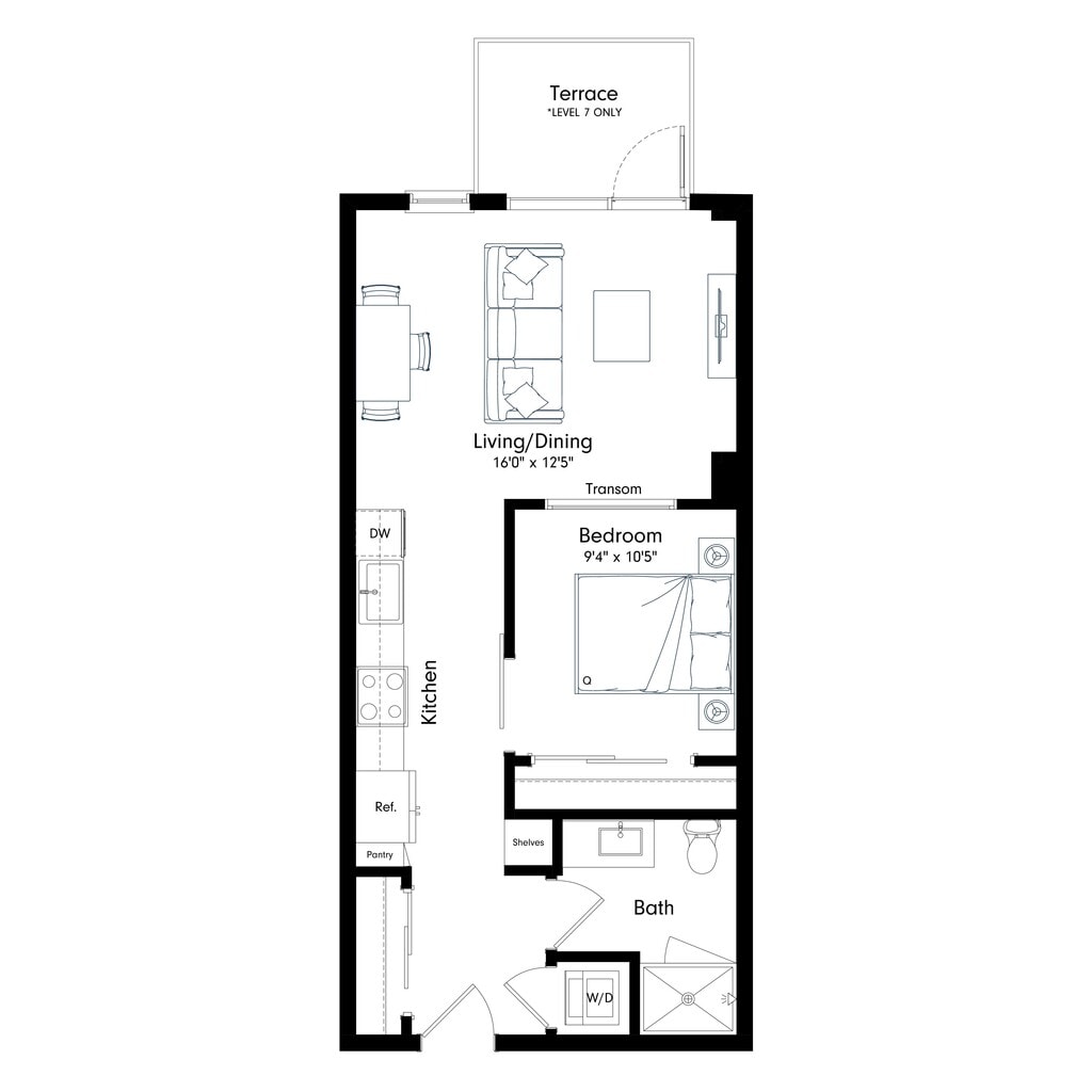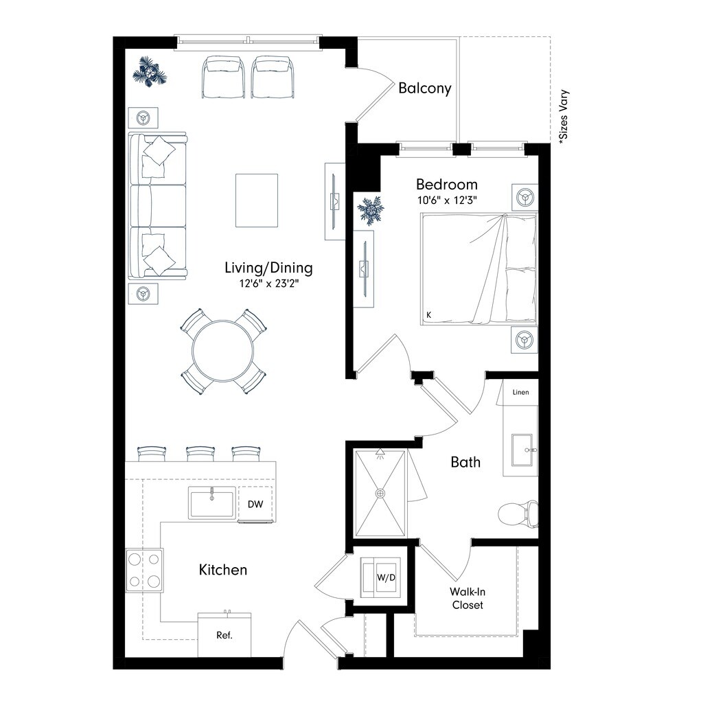 1 Dormitorio, 1 Baño, 735 pies²Precio Mensual TotalDisponible AhoraGalería del Modelo