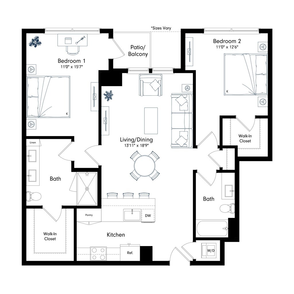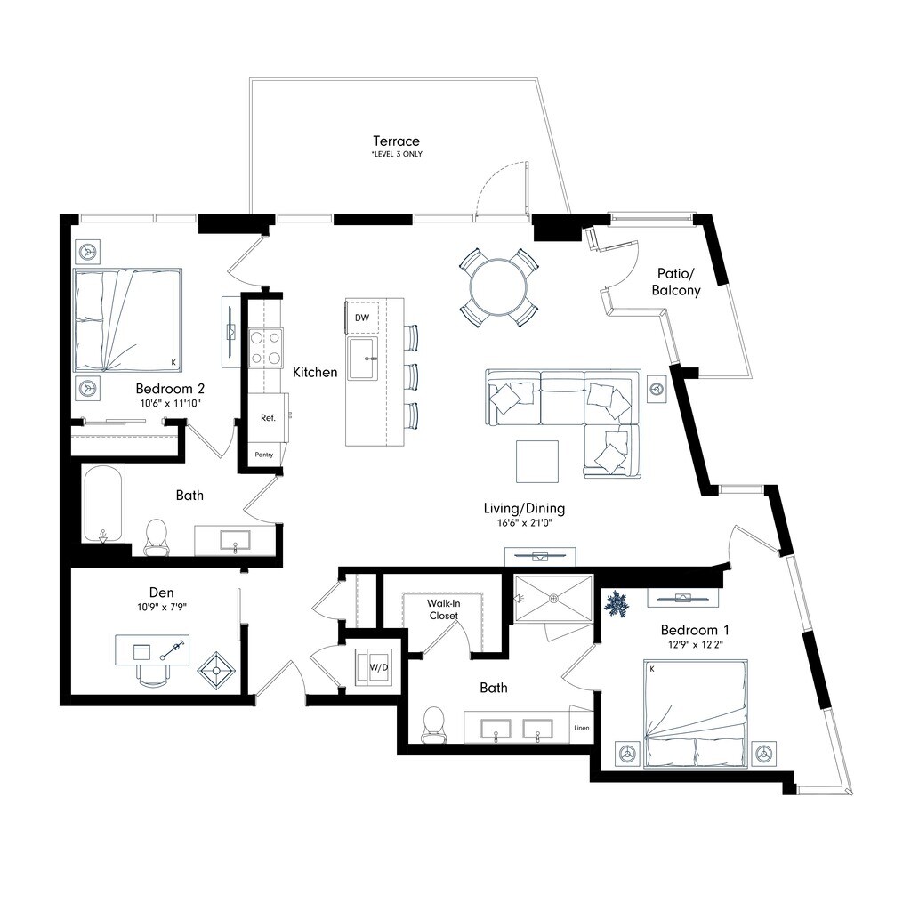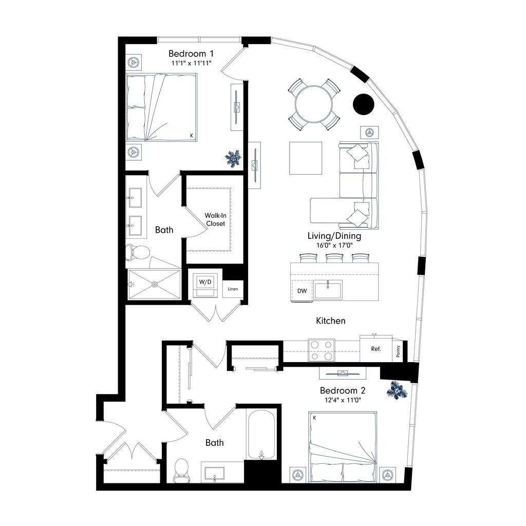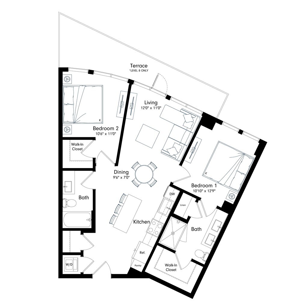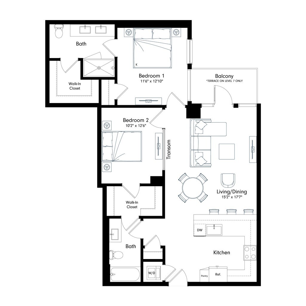 1 Dormitorio, 1 Baño, 735 pies²Precio Mensual TotalDisponible AhoraGalería del Modelo