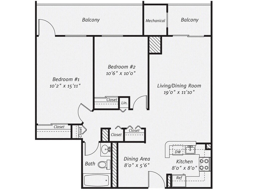 Modelo de apartamento: B2Desde $2,5972 Dormitorios, 2 Baños, 1019 sq ftDisponible Ahora![]()