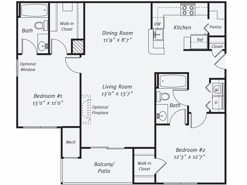 Modelo de apartamento: B2Desde $2,2442 Dormitorios, 2 Baños, 1072-1079 sq ftDisponible Ahora![]()