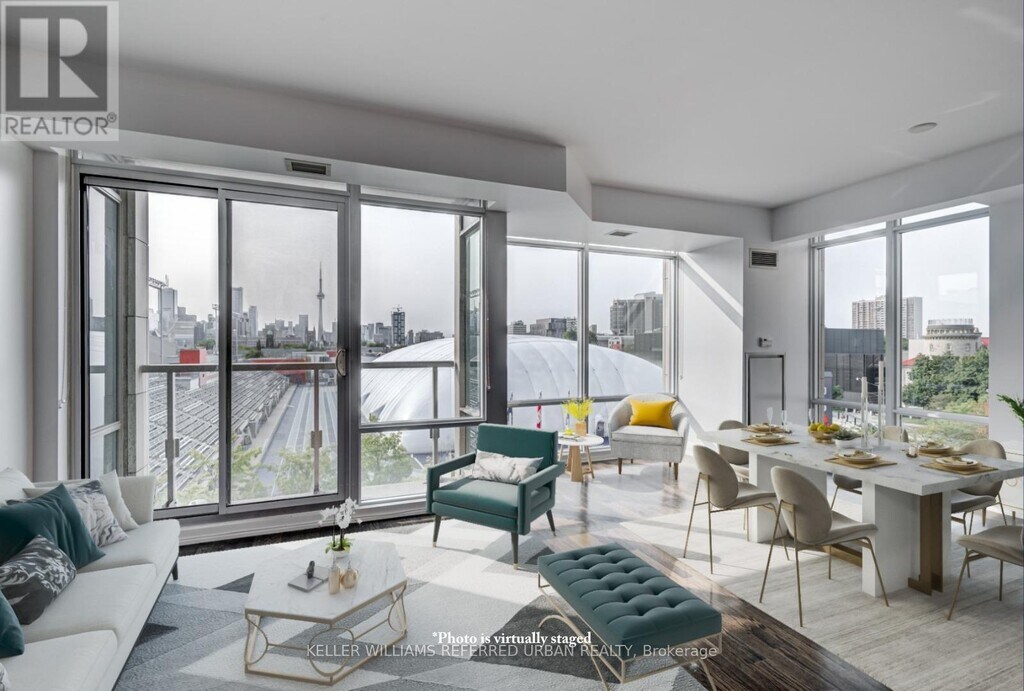 This upscale corner residence offers one of the most sought-after city views,with a direct sightline to the CN Tower. Thoughtfully designed,the layout maximizes space while providing added privacy with bedrooms set apart from the main living area. Enjoy two private balconies,rich hardwood flooring,and a spacious granite island with seating for five-perfect for both everyday living and entertaining. The kitchen is equipped with high-end Miele appliances,while the bathrooms feature elegant Crema Marfil flooring. High ceilings and updated roller shade blinds throughout,including blackout shades in the bedrooms,enhance both comfort and style. Additional highlights include a premium parking space conveniently located next to the elevator on P1 and a rare 4th-floor locker for added ease. Residents of this prestigious luxury building enjoy exceptional amenities,including a pool,24-hour security,fully equipped gym,BBQ deck,and a beautifully appointed party room,with a Starbucks located right below. A rare opportunity to live in a unit with such an incredible view-especially on a lower floor. (id:52069) ID#: 1970765