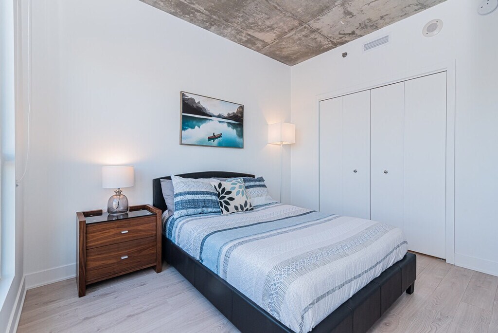 This luxurious new development in Montreal offers a prime location opposite the Esplanade Tranquille, promising both convenience and stunning vistas of the city's vibrant heart. With amenities such as a swimming pool, gym, and terrace, this apartment offers a lifestyle of comfort and leisure. Situated near the Saint-Laurent metro station, commuting is effortless, while the panoramic views allow you to admire the city's beauty from every angle. This space welcomes two guests and features one bedroom with a double bed and a full bathroom. After visiting some exceptional apartments ourselves, we've strived to make this apartment as welcoming and cozy as possible. Enjoy a smart TV for your viewing pleasure and stay seamlessly connected with high-speed Wi-Fi throughout your stay. Indoor parking with in and out privileges is available for an additional fee, depending on your length of stay. We also offer a variety of cleaning services, including biweekly or monthly options, for an extra charge. No parties of any kind or loud noises that can alter the harmony of residents are allowed. No smoking of any kind, including cannabis and cigarettes, is permitted inside the apartment, on the balcony, or within the building. Please care for your home away from home.