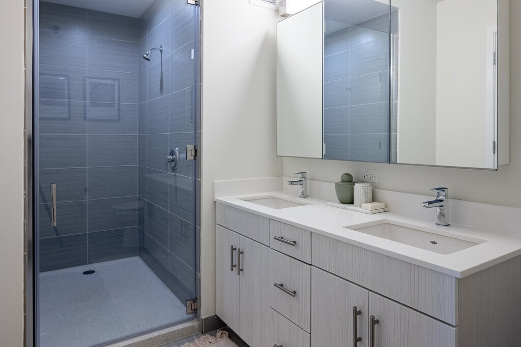 - Terrazzo base and glass-enclosed shower