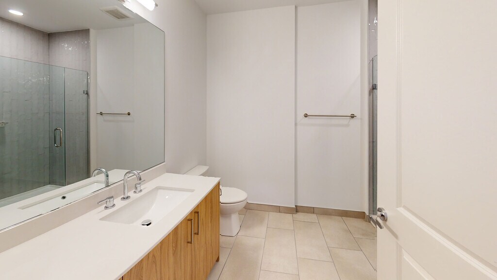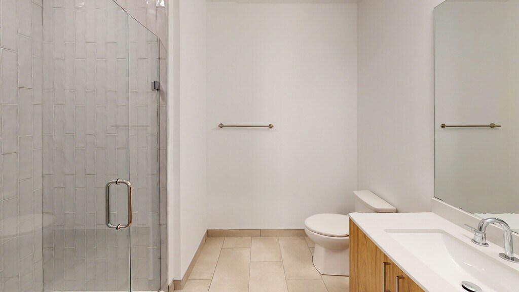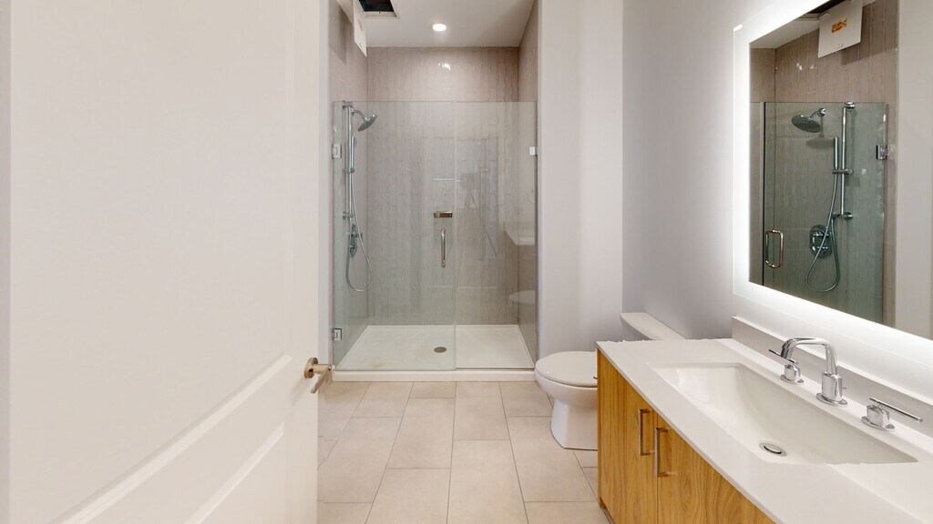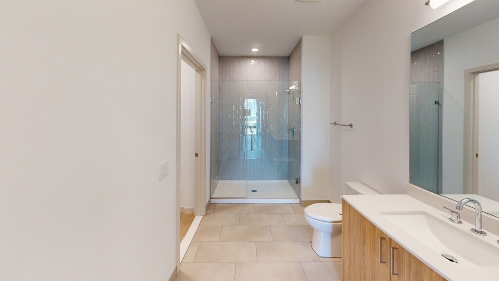 - Frameless glass enclosed shower