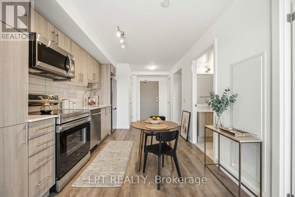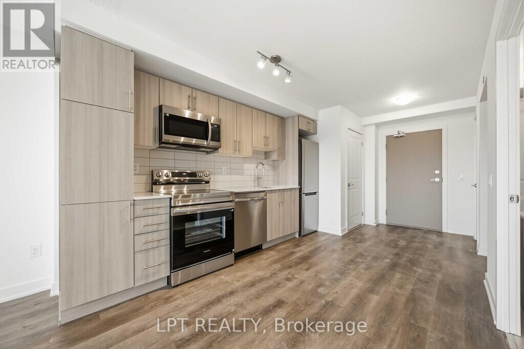 Welcome to Universal City East,a vibrant new condominium community in Pickering's desirable Bay Ridges neighborhood. This thoughtfully designed one-bedroom + den suite offers approximately 585 sq ft of interior living space,plus up to 117 sq ft of private outdoor balcony space,creating a comfortable and functional home. This east-facing unit is filled with beautiful morning light and features laminate flooring throughout for a modern,seamless look. The modern kitchen showcases quartz countertops,stainless steel appliances,and contemporary cabinetry,flowing effortlessly into the open-concept living and dining area-perfect for both everyday living and entertaining. The separate den provides a versatile space ideal for a home office,study,or guest area. The enclosed bedroom offers privacy along with practical closet space,while in-suite laundry adds everyday convenience. Step outside to your private balcony,extending your living space outdoors and offering a great spot to relax and enjoy the east-facing exposure. Residents enjoy access to premium building amenities,including concierge service,a fully equipped fitness center,yoga studio,co-working lounge,outdoor pool,sauna,and entertainment terrace,delivering a complete lifestyle experience. Ideally located minutes from Pickering GO Station,Highway 401,Pickering Town Centre,waterfront parks,local restaurants,and the Durham Live entertainment district,this unit is perfect for professionals or couples seeking modern,low-maintenance living in a fast-growing,commuter-friendly community. (id:63800) ID#: 2150036