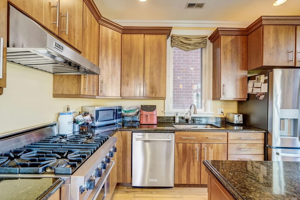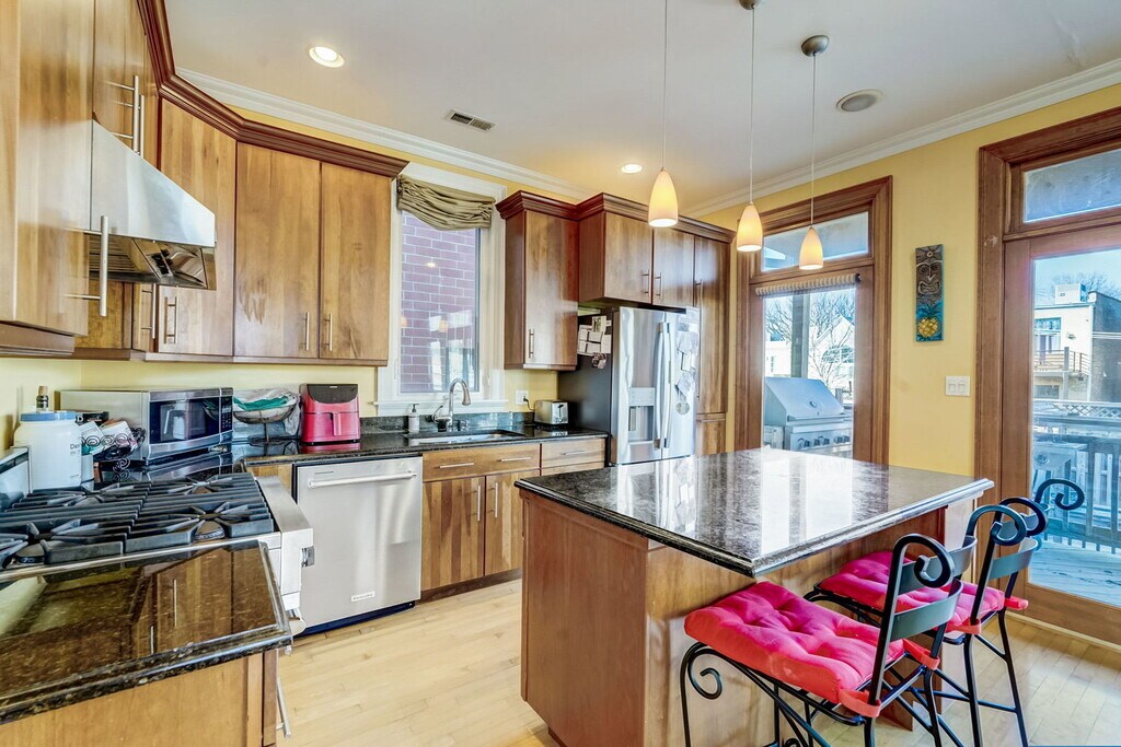 This exquisite 3-bedroom, 2-bath duplex in the highly sought-after Lincoln Park/DePaul neighborhood offers approximately 2,300 sq. ft. of beautifully appointed living space, combining modern updates with timeless charm. The professionally decorated interior features soaring ceilings, maple hardwood floors throughout, and oversized bedrooms with generous closets, providing flexibility for a primary suite, guest accommodations, or a home office/fitness area. A brand-new chef's kitchen is the centerpiece of the home, boasting granite countertops, a Viking Range with built-in grill, wine fridge, dishwasher, and abundant cabinetry, all opening seamlessly to a massive great room with incredible views and natural light. Perfect for entertaining or everyday living, the home offers three private decks-including one over the garage-along with a professionally landscaped backyard for outdoor enjoyment. Additional conveniences include central heat/air, in-unit washer and dryer, and two garage parking spaces available beginning September 1 for just $100 per month each, with ample permit street parking nearby. Situated on Montana Street just west of Sheffield and only steps from the Fullerton L stop, this home provides unmatched access to award-winning restaurants, shops, nightlife, parks, and all that the Lincoln Park/DePaul area has to offer.