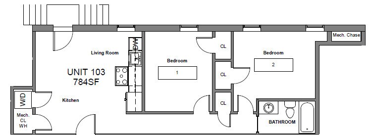 Apartment Unit: 103Apartment Model: Private Walkup entrance$2,1002 Bedroom, 1 Bath, 784 sq ftAvailable NowUnit: 103 - Floorplan 1