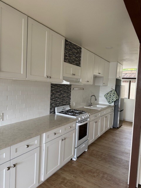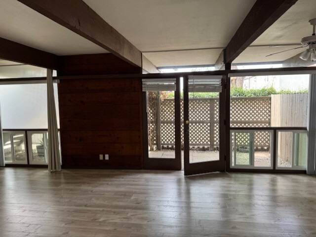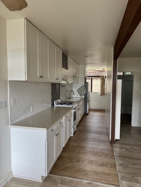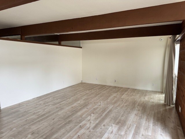 One bedroom One bathroom updated kitchen includes stove and refrigerator Hardwood Floors throughout one parking space in back of unit with private storage bin no pets $2300 per month $3000 security deposit Great residential area only a five unit building post and beam building private patio community laundry facilities