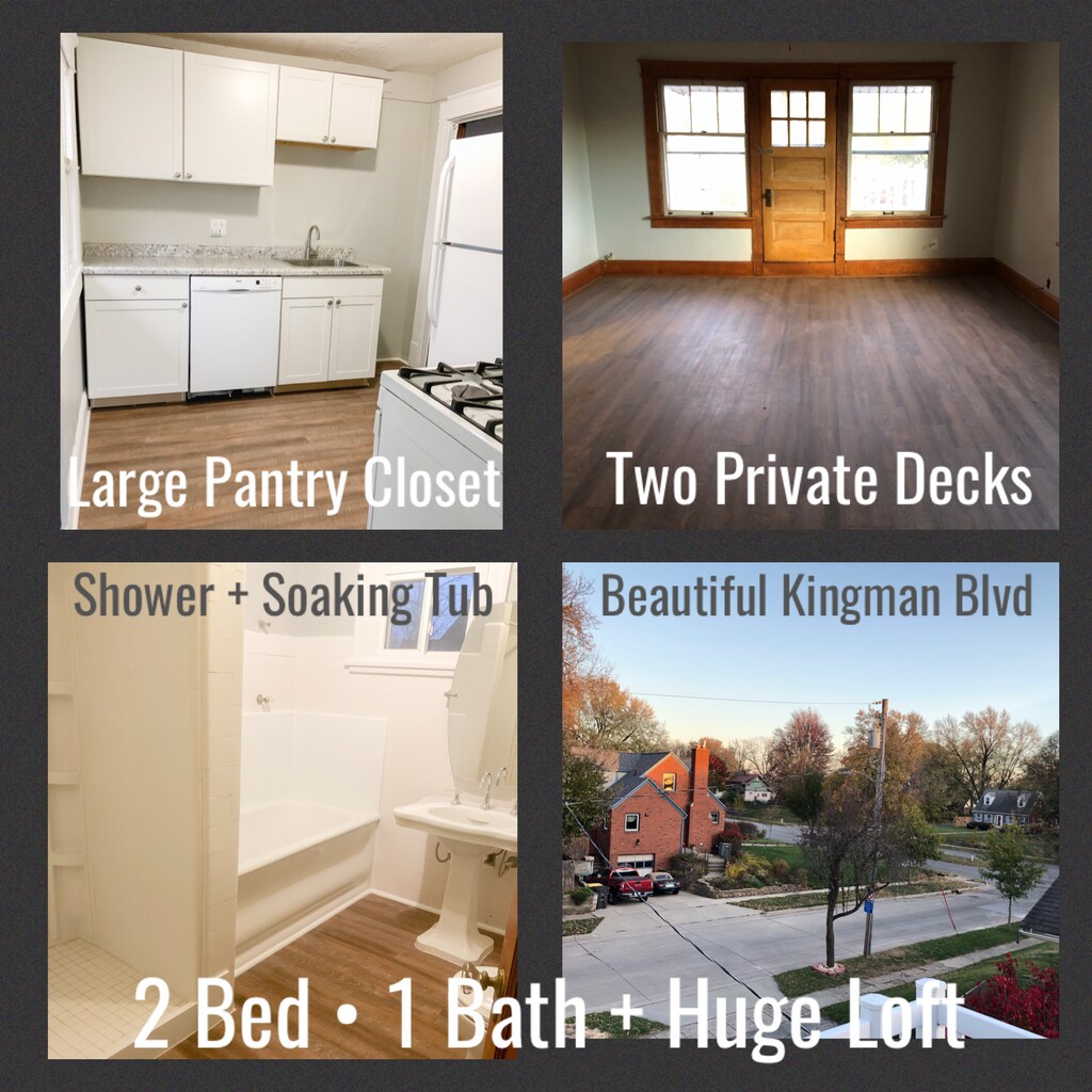 Top floor unit in a Tri-Plex (3 unit) House Available October 1st Very LARGE freshly remodeled 2 Bedroom/1 Bath on the corner near beautiful Kingman Blvd with huge attic loft perfect for a picturesque office space or relaxing hideout. You will love how big the space is compared to a traditional apartment! Lots of privacy, yet no yard work or additional expenses of renting a house. Front and rear outside balcony decks with private back entrance. Nice, quiet property with only 2 other units (with 1 tenant each). Free internet included! - 1 Car Garage & Off Street Parking - Private Entrance - Two Private balcony decks - Free Laundry on site - Heat & Water Paid, you pay electric only - No Smoking on Premises - Cats will be considered - $1200 Deposit Must pass background & credit check