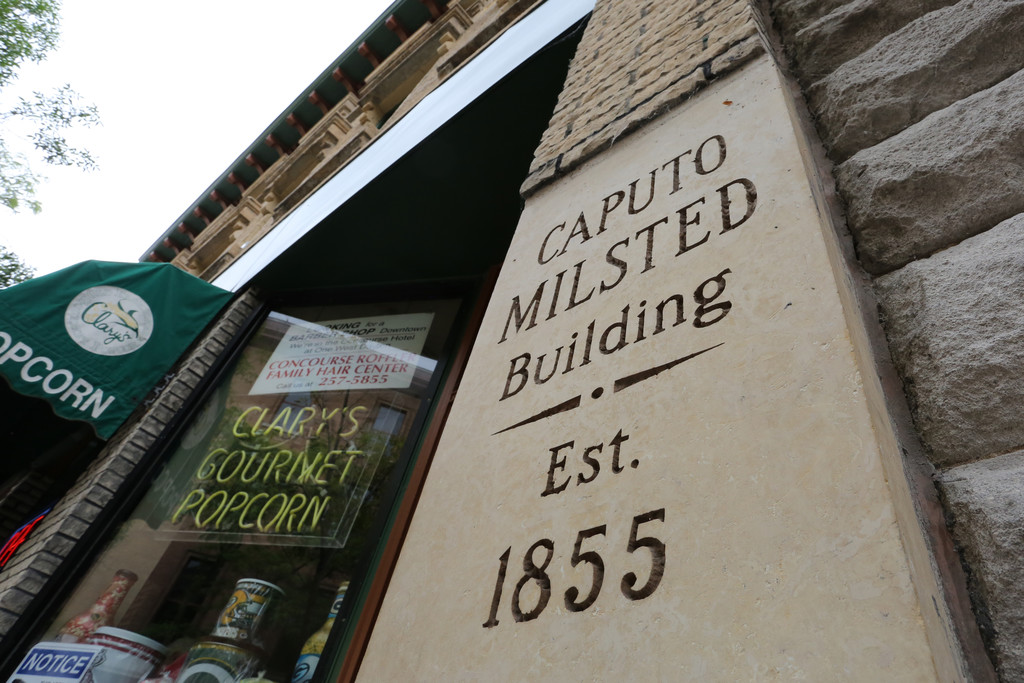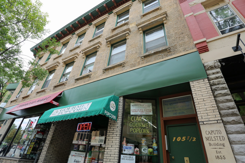 Built in 1855-56 by Willett S. Main, the Main Building is the oldest building facing the Capitol. It was designed by Stephen Vaughn Shipman. The building was the first major commercial structure west of the Capitol Square. In the past 110 years, it has served a wide variety of uses, from a dry goods store to a skateboard supply shop. Before its restoration, post-World War II remodeling and a lack of maintenance had taken their toll on the building's grandeur. The stone exterior walls had been painted and some stone details had been lost to weathering. This past summer, owners Maria and Dan Milsted began restoration of the historic structure. The walls were power washed and chemically treated with great care to remove the exterior lead-based paint. Stone was quarried from the original source in the Town of Westport, matching stone window hoods and brackets were carved, and an unneeded doorway was covered. Wooden components of the building were repaired and painted. Future plans call for the restoration of the storefront to a design that resembles the original.