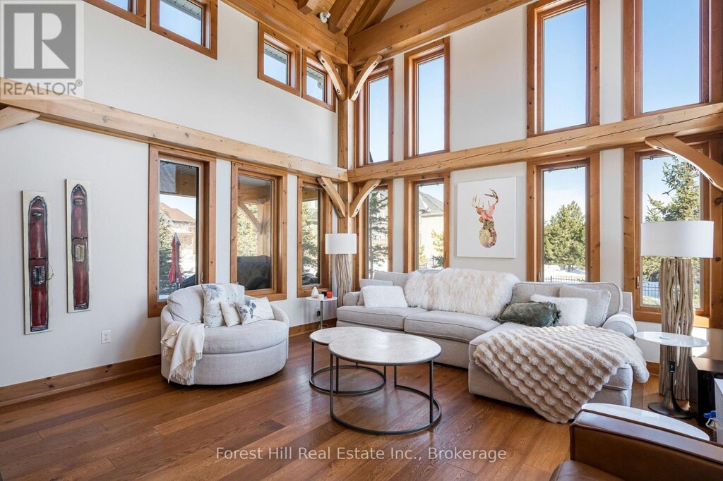SUMMER SEASONAL (June/July/Aug) Enjoy an unforgettable summer in this exceptional 5 BED,5 BATH chalet located in the prestigious Orchard community,just minutes from Craigleith and the heart of Blue Mountain. Perfectly positioned with views toward the south side of Craigleith Ski Club,this elegant Lake Louise model offers refined post-and-beam architecture,generous living spaces,and seamless indoor-outdoor living for the ultimate warm-weather retreat. The main level features a bright open-concept living and dining area with striking Douglas fir beams,oak-engineered hardwood floors,and a beautiful wood-burning fireplace that anchors the space. The chef-inspired kitchen includes granite countertops,ample prep space,a large pantry,and direct access to the functional ski/mudroom with heated floors and convenient dog wash. A welcoming den near the front entrance provides the perfect spot for reading,relaxing,or working remotely. Upstairs,the primary suite offers a private retreat with a spa-inspired ensuite. A second bedroom includes its own ensuite,while two additional bedrooms and another full bathroom provide comfortable accommodations for family and guests. The fully finished lower level features 9-foot ceilings,a spacious games area,a 5th bedroom,and a full bathroom,creating the ideal hangout space after a day exploring the area's trails and beaches. Step outside to the newly built deck with hot tub overlooking the ski hills,while the expansive backyard provides plenty of room to relax,entertain,and enjoy the fresh mountain air. The home is equipped with a Sonos sound system that extends throughout the interior and outdoor spaces. Located just minutes from Craigleith Ski Club,the Tennis Club,community pool,Blue Mountain Village,and the shores of Georgian Bay,this property offers convenient access to hiking,biking,golf,swimming,and all the amenities that make Blue Mountain a premier four-season destination. (id:52069) ID#: 2069092
