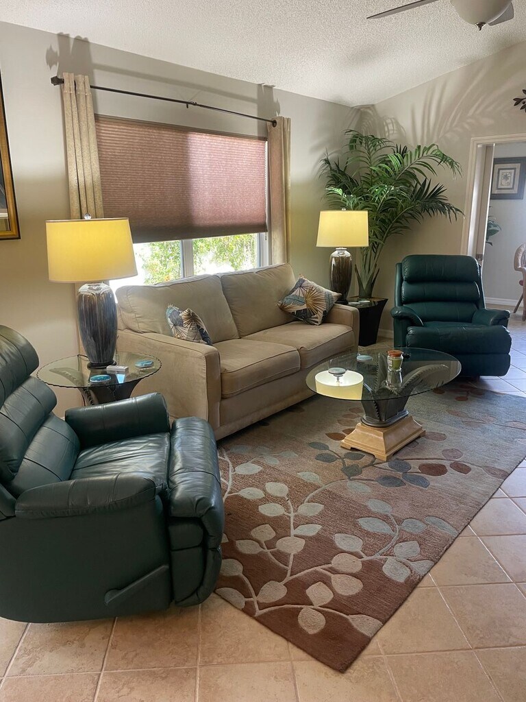 This Villa is in the popular area of Lake Sumter Landing where all the fun and activities are. Located in the very popular Village of Bonita. You have multiple pools, golf courses, recreation centers and major shopping within a few minutes by golf cart. You are close to the Mallory and Havana Country Clubs. 2 miles from Sumter Landing. Optional for extra charge: NEWER 4-seater Yamaha gas golf cart. Our home is a two-bedroom & 2 bath stucco Courtyard Villa and has been upgraded with granite counters in the Kitchen and both Baths, and has newer stainless steel appliances with natural gas cook top. The Kitchen has white cabinets with Pull-Out Shelves, eat-in kitchen table and chairs, and a pantry and tiled floors. The Main Living/Dining area feels even more spacious with vaulted ceilings and tiled floors. High end dining set is next to sliding doors which takes you to the patio and grill area. The laziboy couch is joined with 2 leather recliners. Pocket door sliders take you into the den/enclosed lanai. There is a door to the enclosed back yard from here. The master Suite offers a king luxury sealy mattress with high-end furniture. There is an En-Suite Bath with a Spacious Walk-in Closet, Granite Counters and a Tiled Shower. The Guest Room has a queen bed with an en-suite full bath (with a Tub/tiled Shower Combination and Granite Counter), making for a very comfortable private suite for your occasional guests. Many extras include upgraded light fixtures, newly expoxied garage that will hold 1 car and 1 golf cart, newly painted patio concrete. The kitchen is fully stocked, complete with bake-ware, coffee maker and all the plates and utensils you need. If you like to BBQ you can grill out on the patio with the Weber gas grill. Two new 2022 Samsung Smart TVs (54 & 32 inches). This is a SMOKE free environment in and around the property. Rental rates are based on two (2) people. $2300 security deposit. The Villages requires Resident temporary ID, which costs $50 for 2 people, Payable directly to the Villages, this gives you use and free entrance to all golf courses, rec centers, discounts for movie theaters, pools and more. Short term guests can obtain a guest pass for free which includes all amenities except free golf and sports pools. The Villages is an active Senior Community for residents 55yrs + Criminal and Background check. Guaranteed you will love this location and Villa! Owners live 1/2 mile away for any issues you may have. All issues will be promptly addressed.