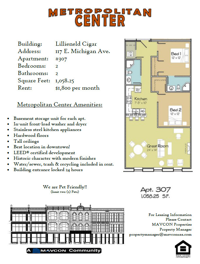 1 Bedroom to 2 Bedroom Apartments at 107-123 E Michigan Ave currently range from $1,100 to $1,700