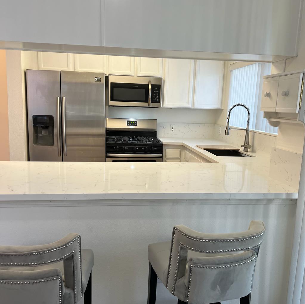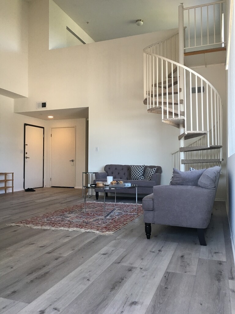 2 separated master bedroom, each side of unit with privacy, one bedroom in second floor in loft area with its own closet , with spiral staircase, very private area.+ lots of windows "High Ceiling" + 2 Gated parking side by side "Not Tandem" , Remodeled kitchen with new White Quartz countertop + new kitchen sink + New kitchen faucet, remodeled Bathrooms with new Quartz countertop with new sink and faucet with new Cabinet paint. With Stainless steel Appliance: Stainless steel Side by side fridge, Gas Stove, Microwave, Dishwasher Hardwood floor (Laminate), Large appt in 2003 building in Toluca Lake near Cat and dogs under 20lbs are allowed.