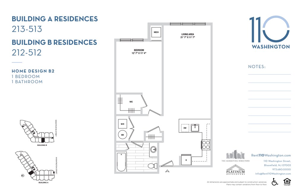 110 Washington offers 1 to 2 Bedroom apartments starting from $2,414 and having 746–1,207 sq ft. Here is the current pricing and availability: