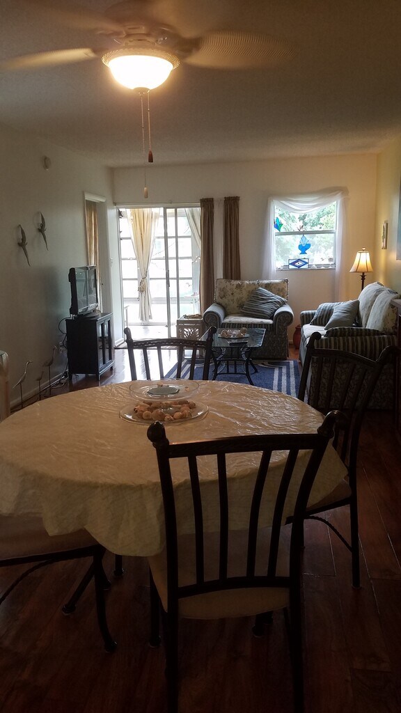 Located minutes away from downtown Vero Beach and a ten minute drive to the Atlantic Ocean an many beautiful and uncrowded beaches! It s located in a good neighborhood and biking or walk distance to many good restaurant parks, shopping and historic downtown where there are always activities like street dances, art shows and lots of live music. Our condo is in a 50+ plus condominium setting. Other occupants in the three story three building community are a good mix of permanent residents and "snowbirds " and Holiday renters. Our place is on the second floor with a private parking spot a short elevator ride away. Laundry room is for our second floor guests and residents. The condo is a 2bdrm with 2 queen beds. Master bedroom has walk in closet , small work desk and medium sized bathroom with shower. There is a sliding door that leads to florida room with comfortable seating and a sweet view of the courtyard and swimming pool. Living room also has a sliding door access to florida room. Hardwood floors in living and dinning room.Large color TV as well. Second bedroom with queen bed has big closet and is close to second bathroom which has bath tub. the kitchen is stocked ,has dishwasher, microwave , stove,fridge and pantry. Tile floor. Unit has central air and heat that was installed new 3 years ago We have owned condo for 12 years and rented every year for holiday seasons with a few renters for second year. We have had great reviews every year and hope you respond for a great 3 and a half month winter getaway. Barbara and Dennis.