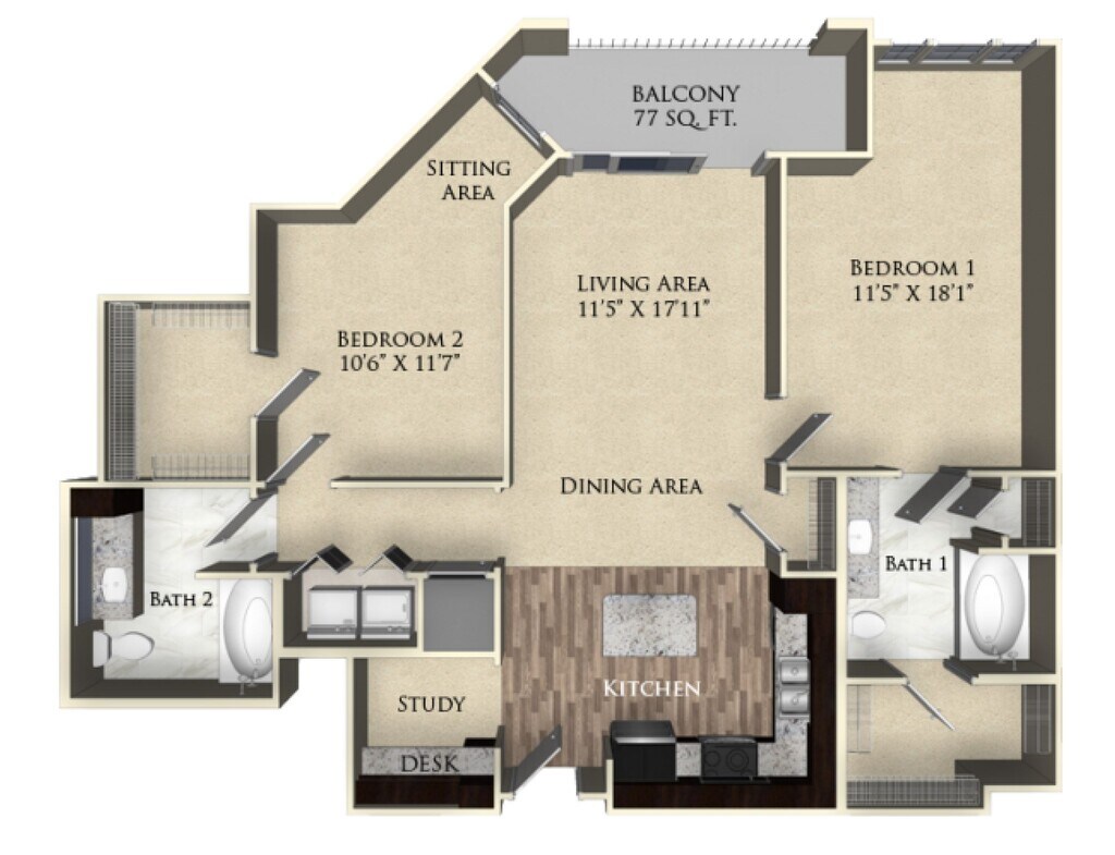 1 Bed, 1 Bath, 670 sq ftAvailable NowModel Gallery