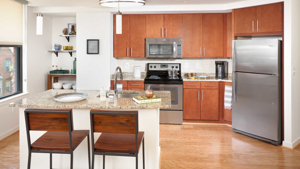 July 24, 2015It looked all fancy and nice when we moved in. Doors knock in to each other. Pocket doors would have been great. Floors are beginning to separate.Fire alarm goes off once a week. 3 banquet grills is not enough for the amount of people who live here. Being close to the Metro and restaurants and shopping is the main reason for living where we do. Seems like they could have done more for the amount of rent we pay.Review from Apartments.com