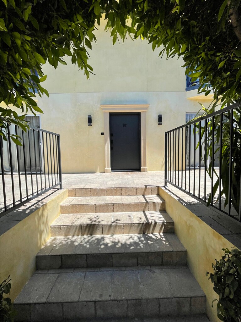 Beautifully gated upper unit flat in prime Brentwood community, large two (2) bedroom two (2) bath w/ hardwood floors, stainless steel appliances, bar counter, gas fireplace, washer/dryer hook-up, with two (2) private balconies surrounded by green hedge facing the front scape. Flat livable is approx. 1,000 sf Walkable to San Vicente Village. Move-in special $3,195