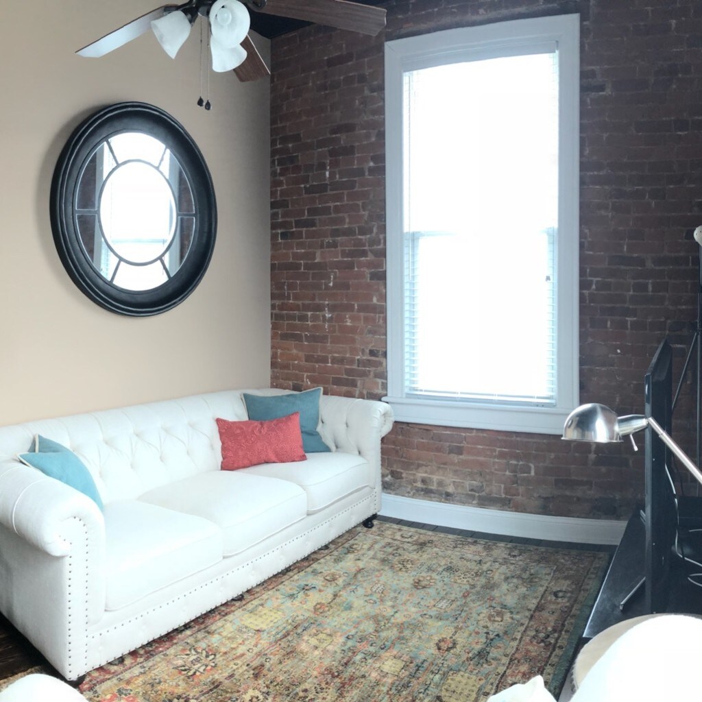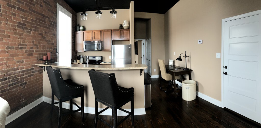 This loft apartment is located on the 2nd floor of a renovated, historic building in downtown Farmington, MO. No pets allowed. This is a one bedroom apartment with a limit of 2 people. The space has lots of character with exposed brick walls, 10.5 ft. ceiling and refinished, original hard wood floors. The bathroom is tile with all new fixtures. The kitchen includes an eat-at counter and has new stainless steel appliances including a dishwasher. There is also a washer/dryer in the unit. The building is secure with a keypad entry and includes a monitored fire alarm system. This building is located within walking distance of several restaurants, bars and coffee shops as well as the post office and numerous banks and churches. The convenience and character of this loft can't be beat. The monthly lease includes cable TV, internet and trash pickup. No smoking allowed. No pets allowed. This apartment is perfect for someone who does not want to live in a large apartment complex.