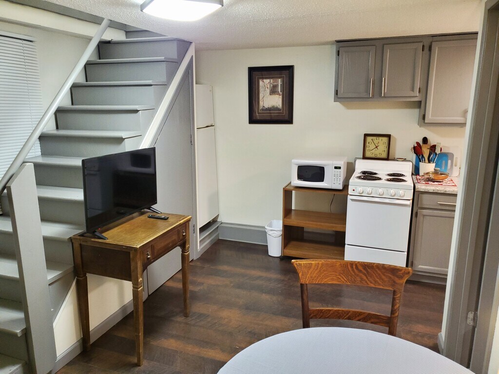 Fantastic FULLY FURNISHED 1 bed/1 bath apartment with ALL UTILITIES and Wi-Fi INCLUDED! Recently updated apartment with convenient dining room and full kitchen with everything you may need on first floor along with the bathroom and shower. A staircase then takes you to the second-floor bedroom which has a double bed and smart TV and lots of closet space. Laundry facilities are on-site in the basement for your convenience. FULLY FURNISHED and completely stocked with all essentials. All you need is a suitcase with your own clothes and everything else is provided. Wi-Fi is provided and TWO Smart TVs are already connected, with one mounted on wall in upstairs bedroom and another on the first floor in the kitchen/dining area for easy viewing whether you are cooking, eating, or relaxing in bed. Free streaming channels are already set up but you can also easily log in to your own streaming services as well. Convenient location on the south side of town with easy access to the freeways and Ft. McCoy as well as to downtown Tomah with its various restaurants, bars, shopping, parks, and other businesses.
