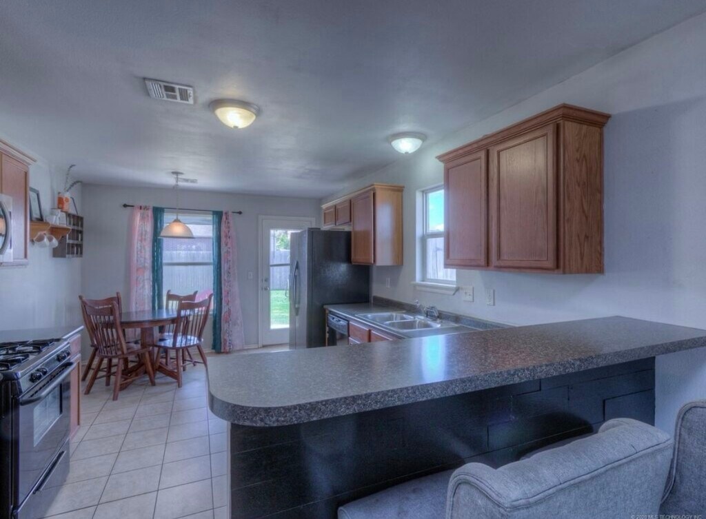 Do not miss this rental in a GREAT location! Located in a 1 circle street neighborhood right off Hwy 151st and Hwy 75. Wonderful Kiefer School District. Adorable craftsman style home with an inviting front porch for a fresh and modern feel. Great neighborhood and minutes away from shopping and dining. Come inside to NEW floors, NEW white paint throughout, beautiful NEW tile bathroom floors, and a functional open floor plan. Relax with the beautiful fireplace in the living room that opens up to the pristine kitchen that features an updated bar exterior and cozy breakfast nook. Covered back patio and large fenced yard. This one won't last long!!