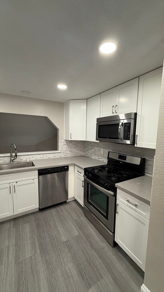 This remodeled condo has two cozy bedrooms and one updated bathroom. The living area is open and connects to a modern kitchen with new appliances. There's also a washer and dryer inside the condo for added convenience. Plus, there's a garage for extra storage and your car.