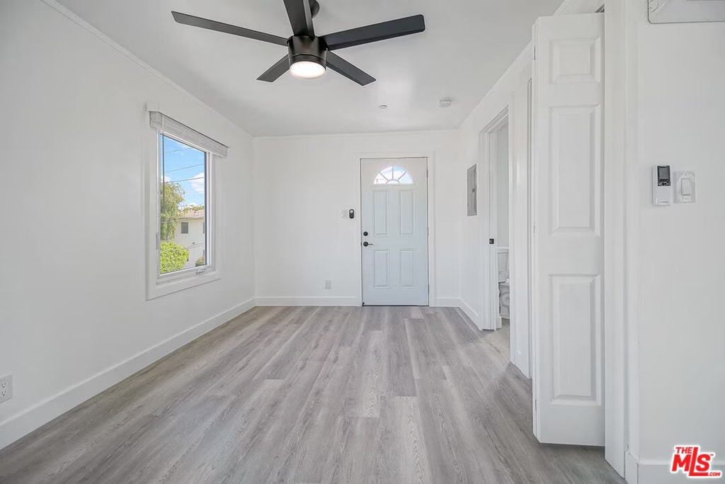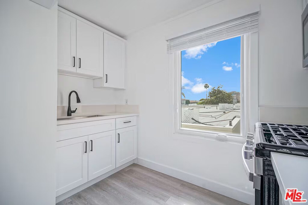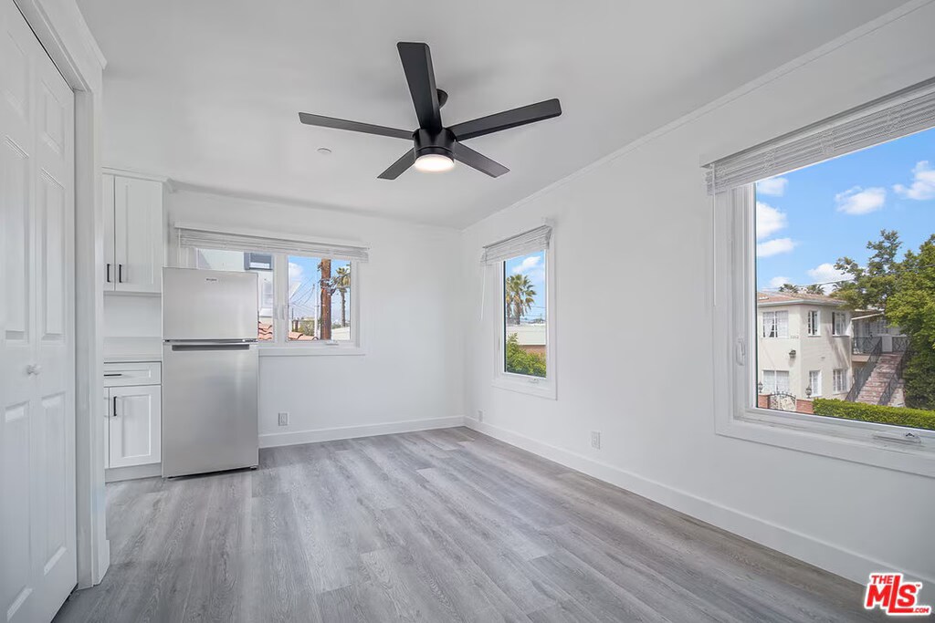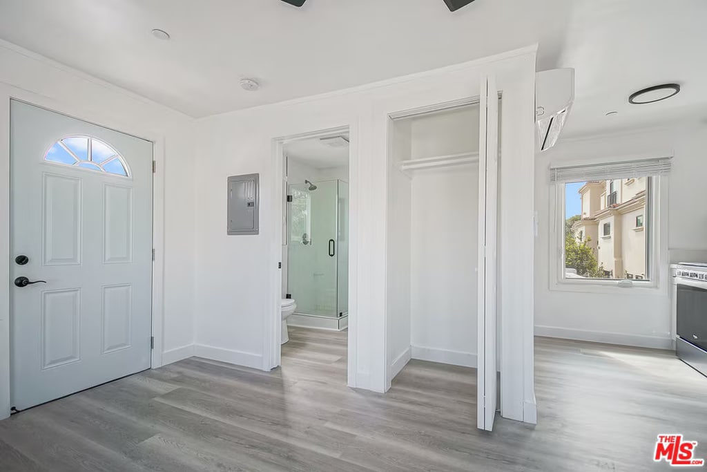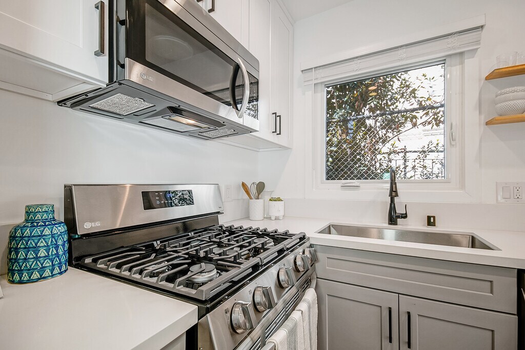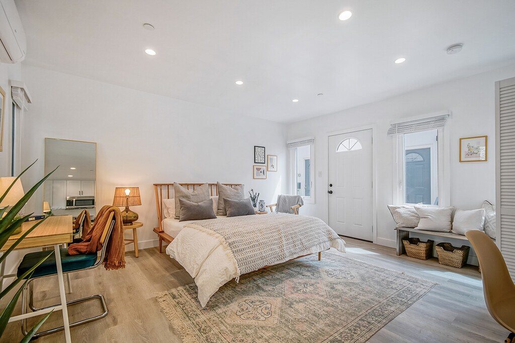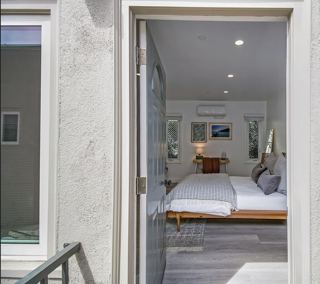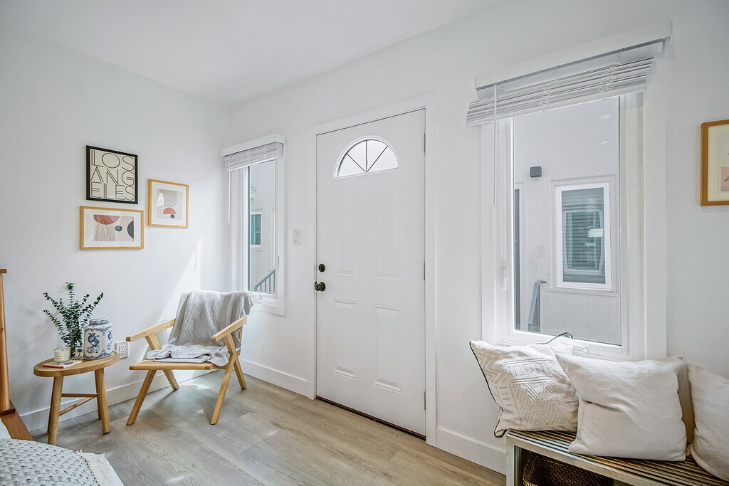Remodeled Santa Monica Bungalow-Style Unit Upper-level unit in a quiet, gated 2-unit building near Wilshire Blvd and the beach. Features include wood-style floors, recessed lighting, large windows with neighborhood views, central AC/heat, and ceiling fan. Open kitchen with quartz countertops, stainless steel appliances, and custom cabinetry. Spacious bath with walk-in shower. Pet-friendly with a private, bungalow feel in a prime location.