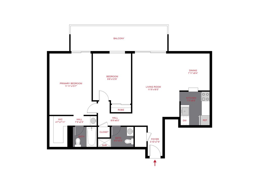 1 Bed 1 Bath A2 - Floorplan 1 2 Bedrooms