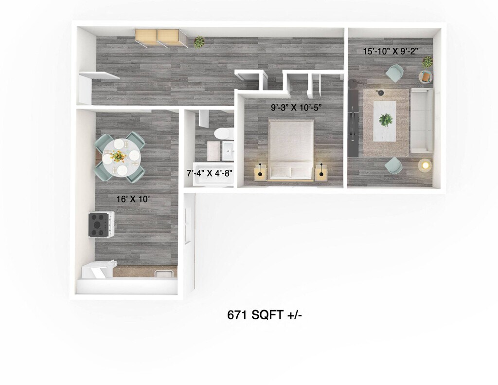 Apartment Model: 129 Lenore - 1 Bedroom, 1 Bathroom - Layout F1 Bedroom, 1 Bath, 671 sq ftAvailable January 1, 2026![]()